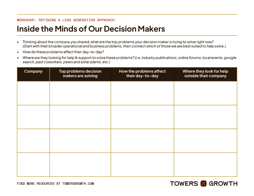 If you’re feeling stuck or overwhelmed, this is what we do every day. We specialize in B2B lead generation that helps our clients build a strategic, connected marketing system to reach their target audience. Contact Towers Growth and let’s talk shop about what’s missing in your lead generation strategy and how we can fix it.